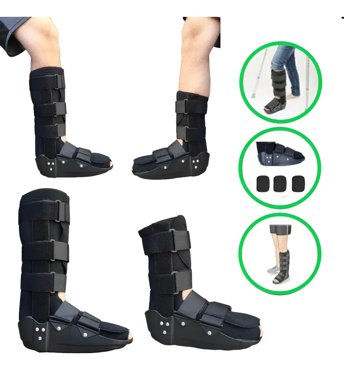 Modelos: Disponível nas versões Curta (foca no pé e tornozelo) e Longa (estende-se até abaixo do joelho para lesões de tíbia/fíbula).