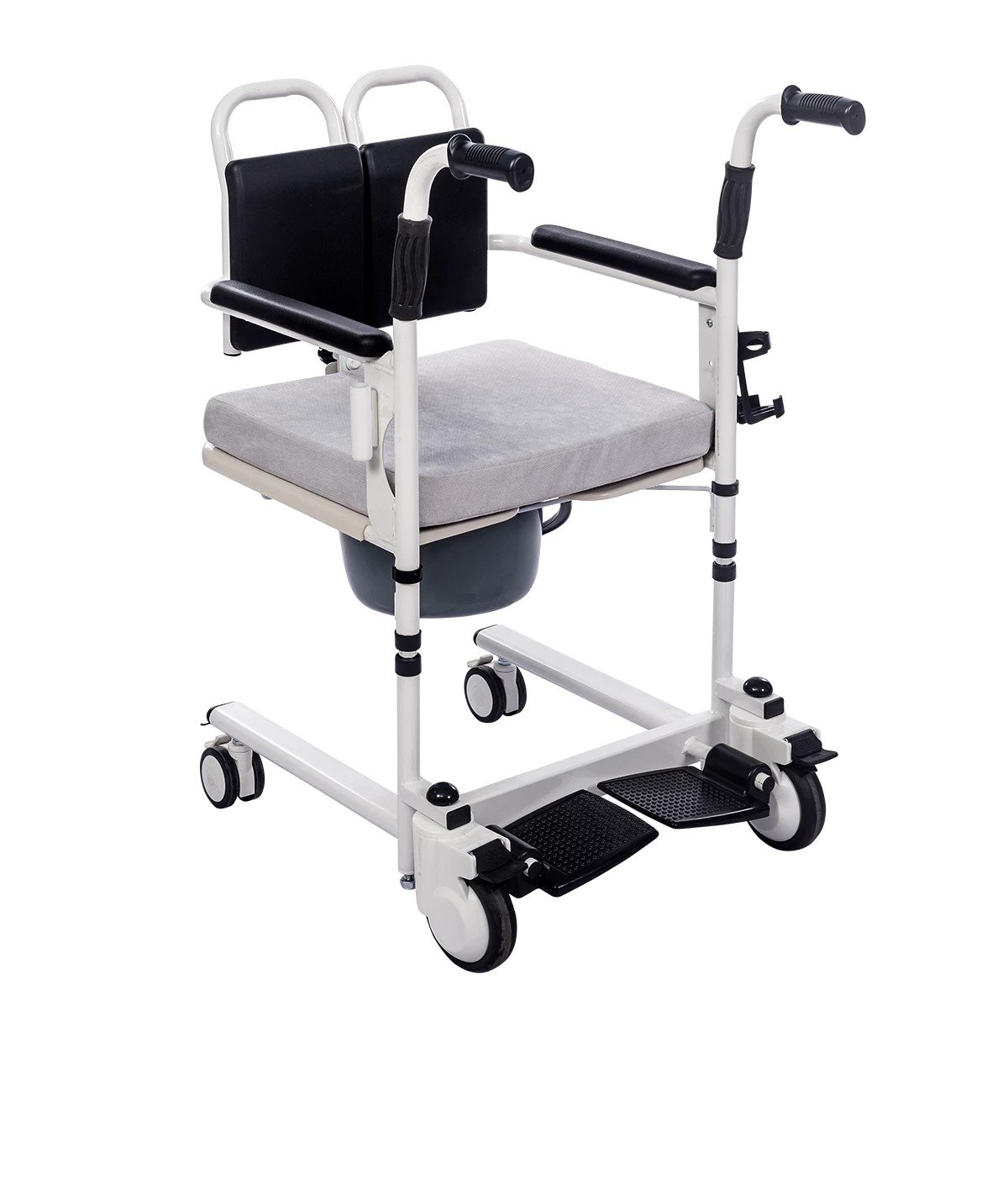 o Apoios de Pés Removíveis/Retráteis: Recuam ou são removidos para permitir a aproximação total ao vaso sanitário ou facilitar a movimentação do cuidador.