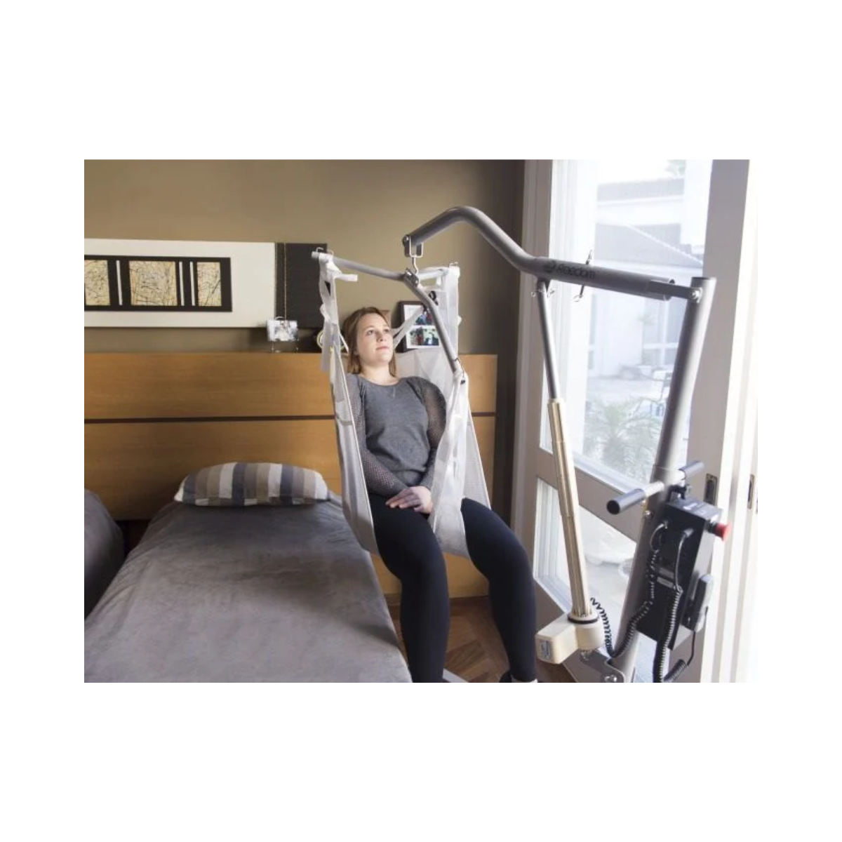 Abertura de Base: As pernas da base são ajustáveis (abrem e fecham), permitindo que o guincho se aproxime de poltronas largas ou contorne obstáculos com facilidade.