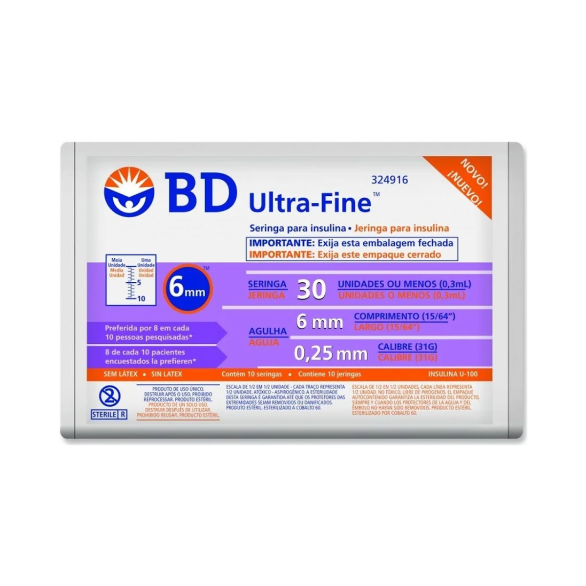 A Seringa BD Ultra-Fine 30 ui 6×0,3mm ( Pacote com 10) é o padrão ouro para pediatria e para adultos com alta sensibilidade à insulina. Por ser a seringa de menor volume, ela permite uma escala de graduação muito mais detalhada do que os modelos de 0,5 ml ou 1 ml.
